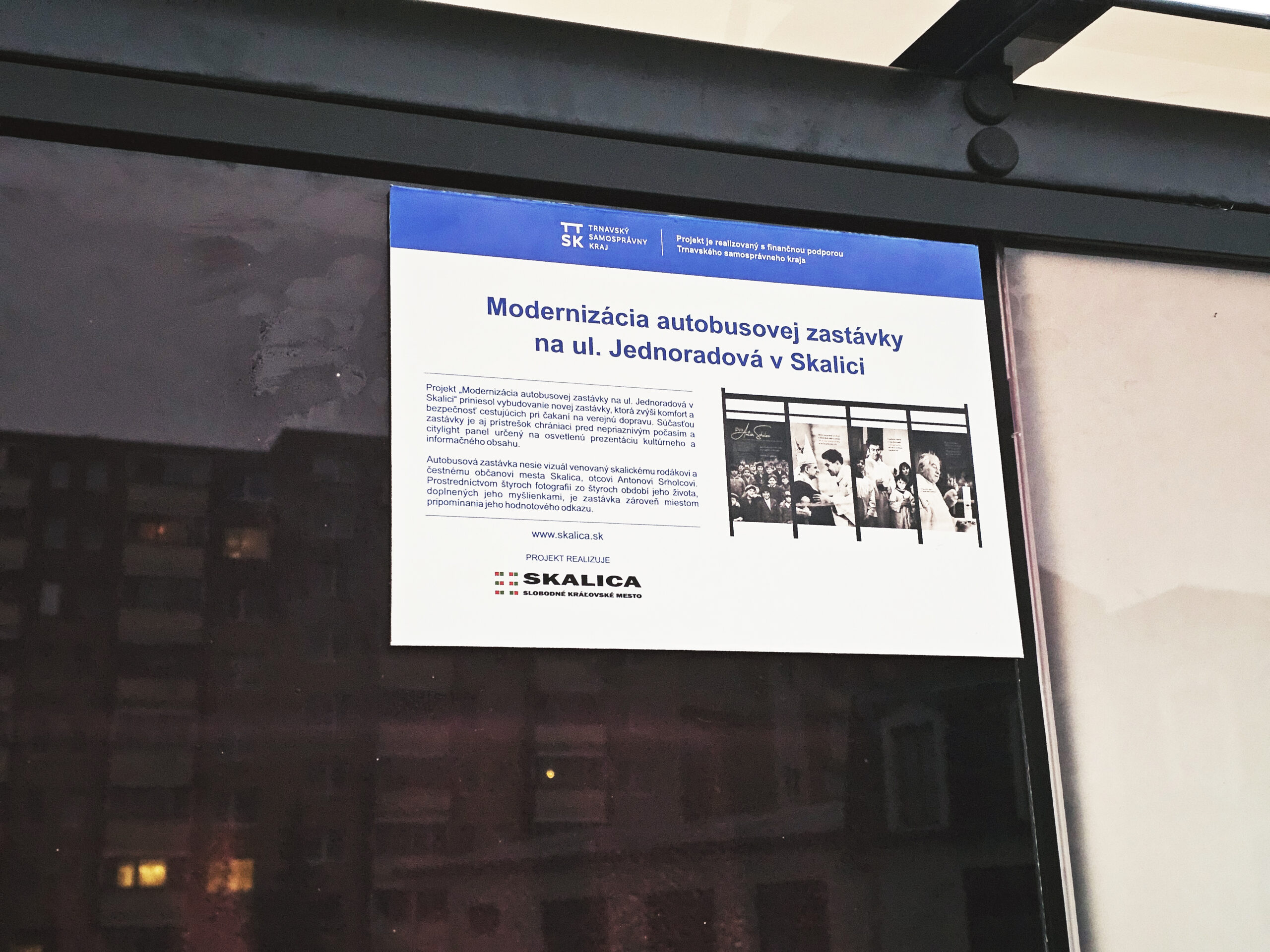 Hlavným cieľom projektu bola podpora a vytvorenie vhodných podmienok na zvýšenie využívania verejnej hromadnej dopravy obyvateľmi a návštevníkmi mesta Skalica. Pre účely dosiahnutia stanoveného cieľa sme zmodernizovali autobusovú zastávku pre autobusové linky na ul. Jednoradová. Modernizácia zahŕňala vybudovanie nového moderného prístrešku z kovovej konštrukcie s presklenými stenami a citylightom, ktorý je určený na propagáciu kultúrno-spoločenských podujatí mesta Skalica. Na presklených častiach prístrešku je umiestnená grafika venovaná Antonovi Srholcovi – jednej z najväčších osobností mesta Skalica a celého Slovenska.